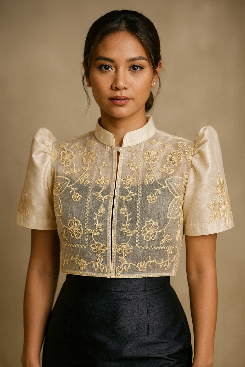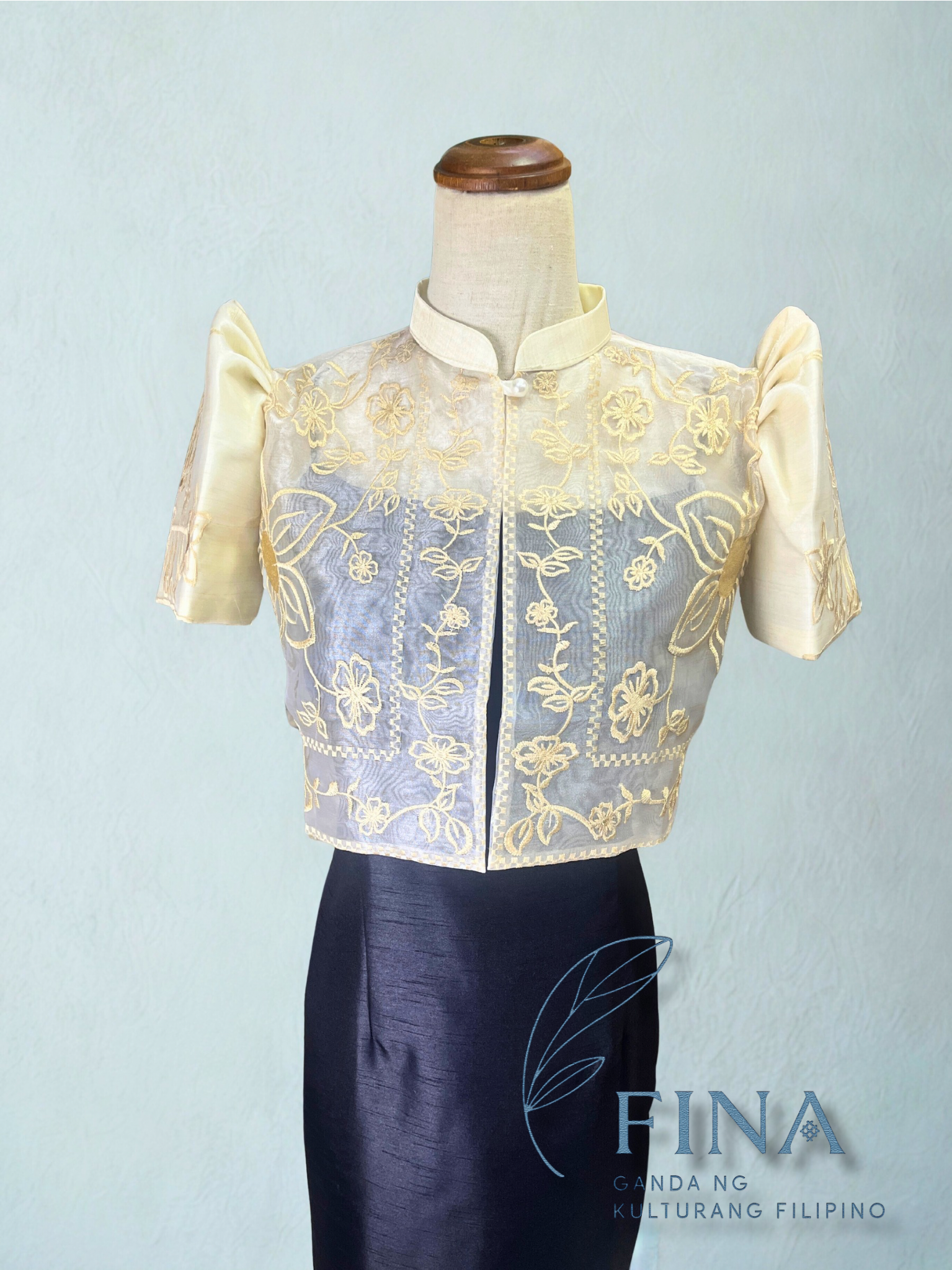 Elevate your Filipiniana look with this elegant Organza Bolero, artfully painted with delicate brown lines to mimic the timeless beauty of piña fiber without the hefty price tag. Crafted from lightweight organza, this bolero delivers a luxurious, formal finish while remaining budget-friendly. Perfect for modern Filipinas who want classic style on a practical budget.