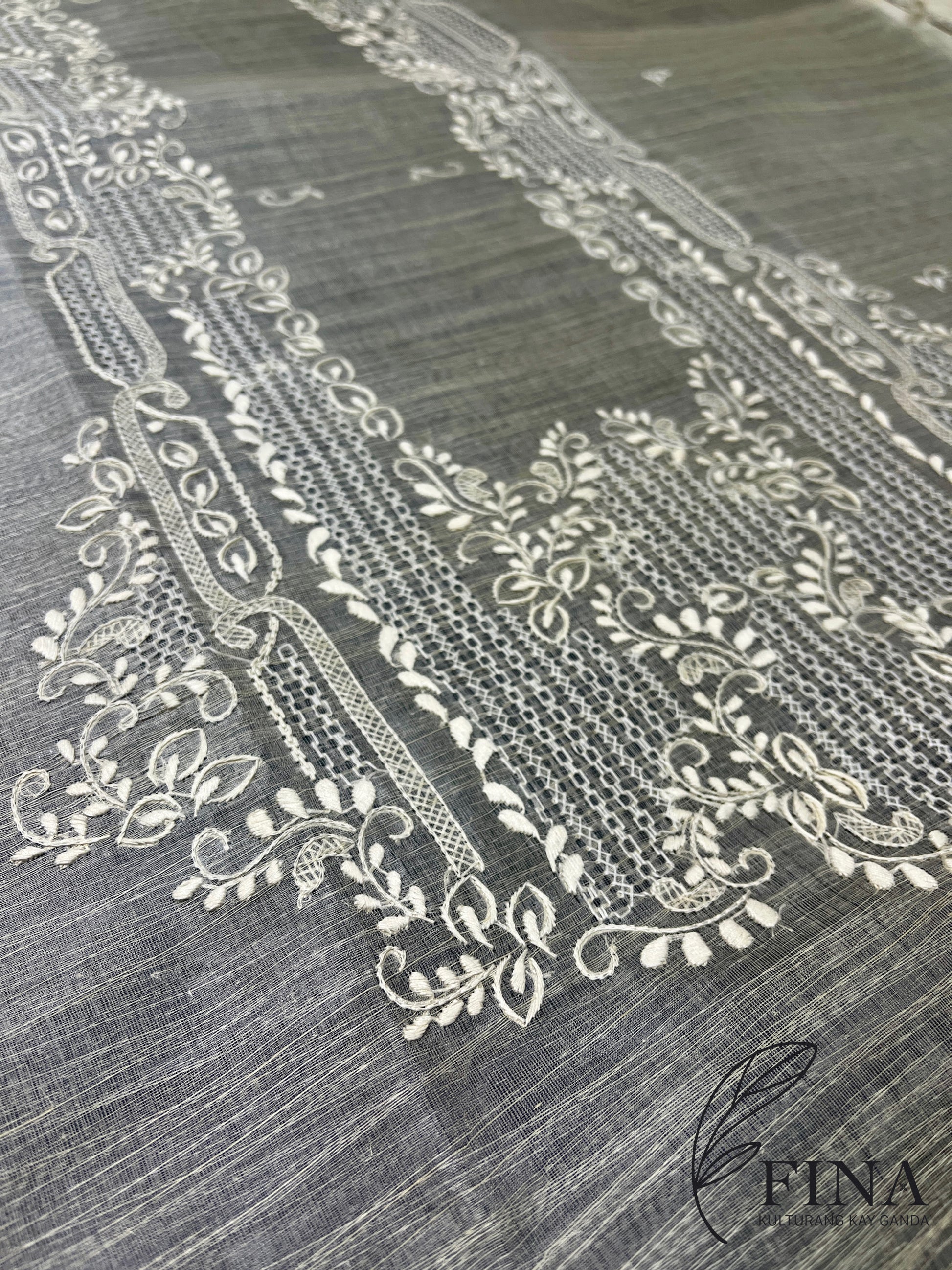 A refined piña-silk fabric panel featuring intricate hand embroidery in a traditional U-shaped pattern. Perfect for Barong Tagalog, this piece showcases the timeless elegance of piña weaving combined with delicate floral and lattice embroidery details.