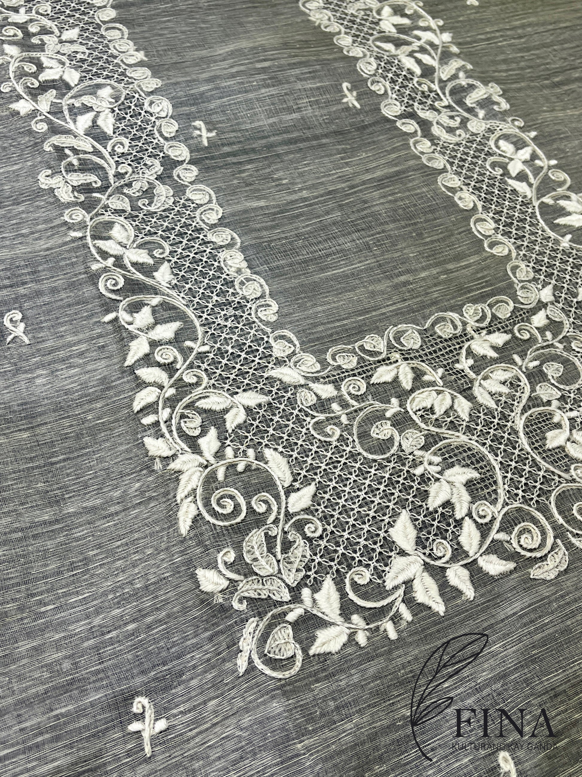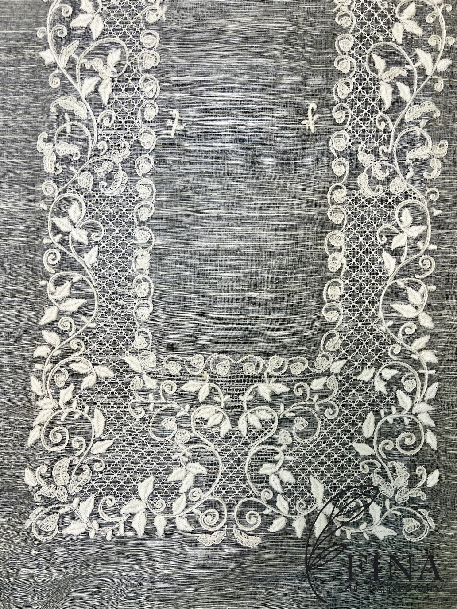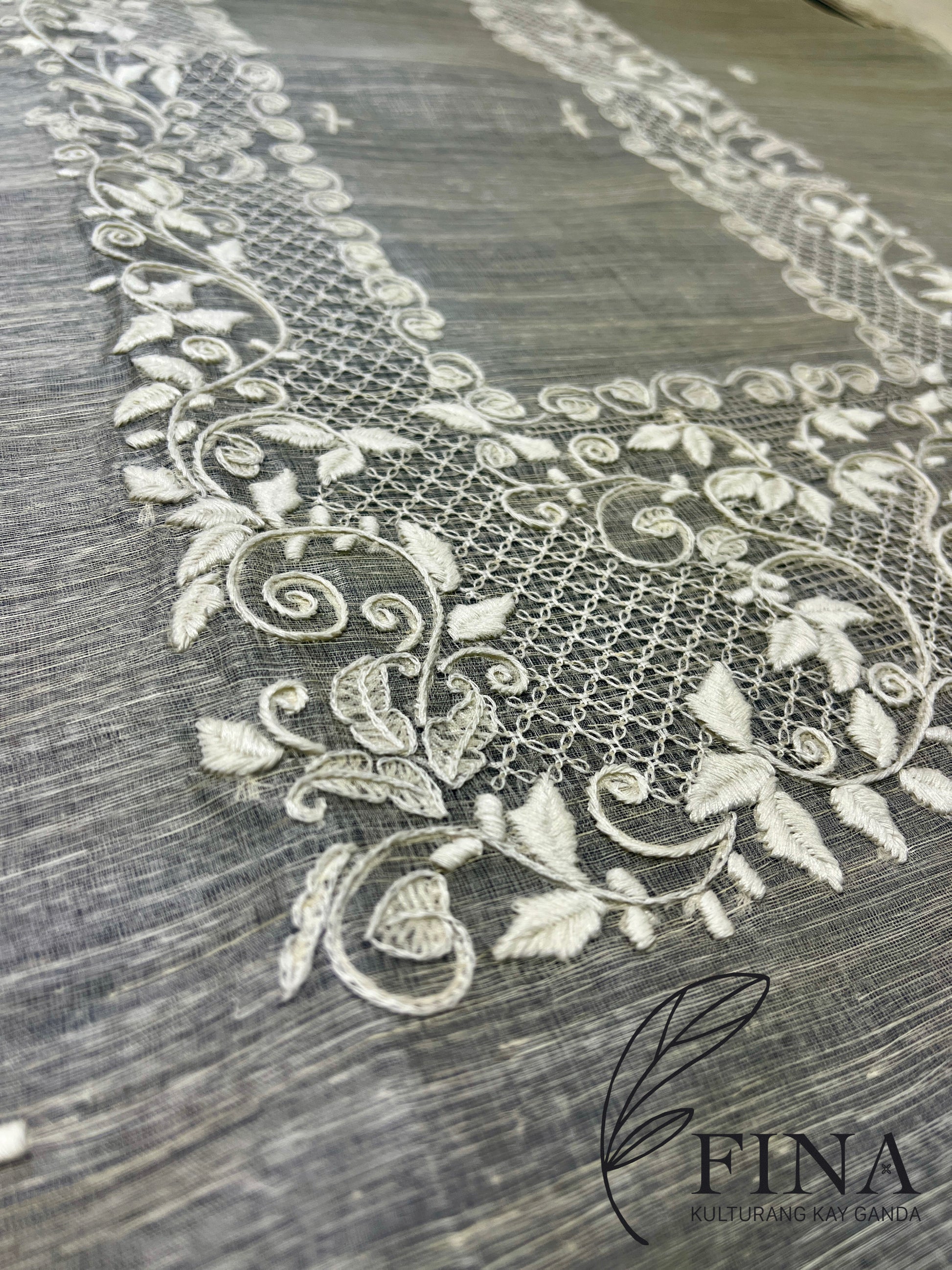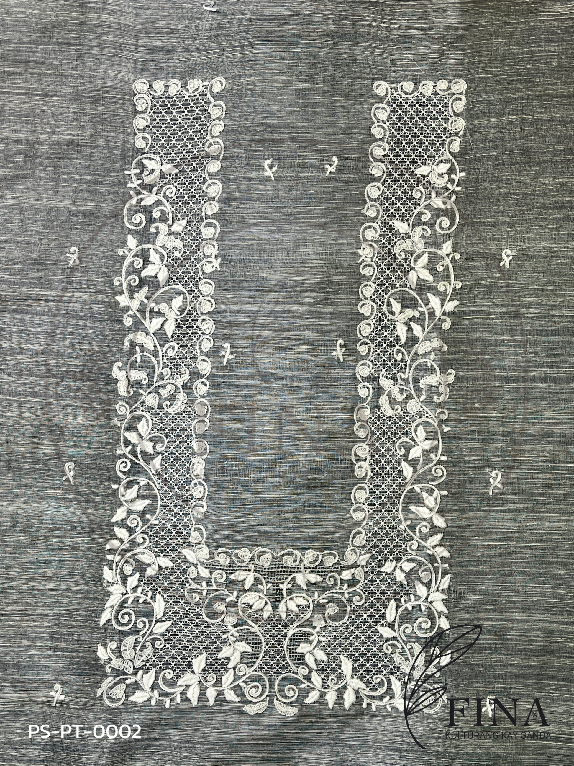 A refined piña-silk fabric panel featuring intricate hand embroidery in a traditional U-shaped pattern. Perfect for Barong Tagalog, this piece showcases the timeless elegance of piña weaving combined with delicate floral and lattice embroidery details.